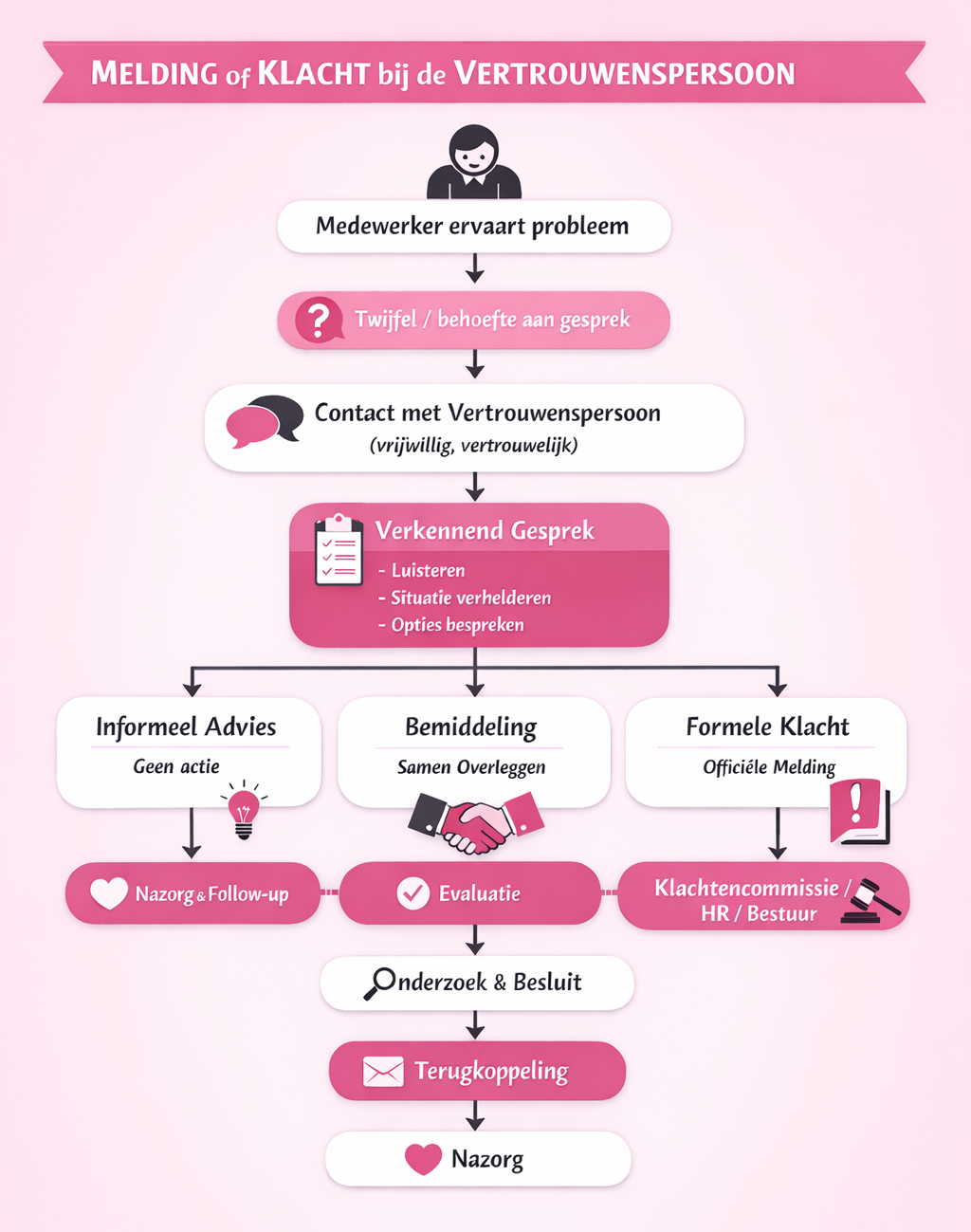 - Heldere rolafbakening tussen vertrouwenspersoon, HR en management